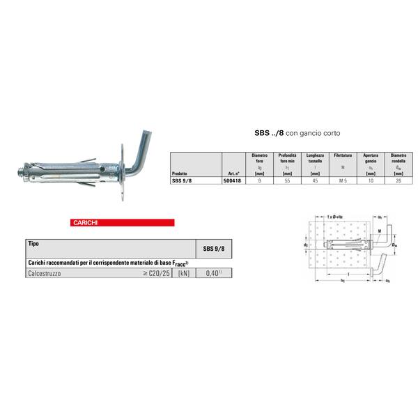 TASSELLI METALLICI FISCHER SBS 9/6 GANCIO LUNGO